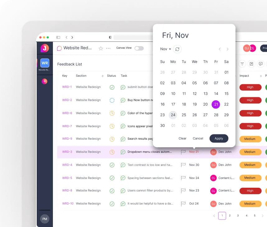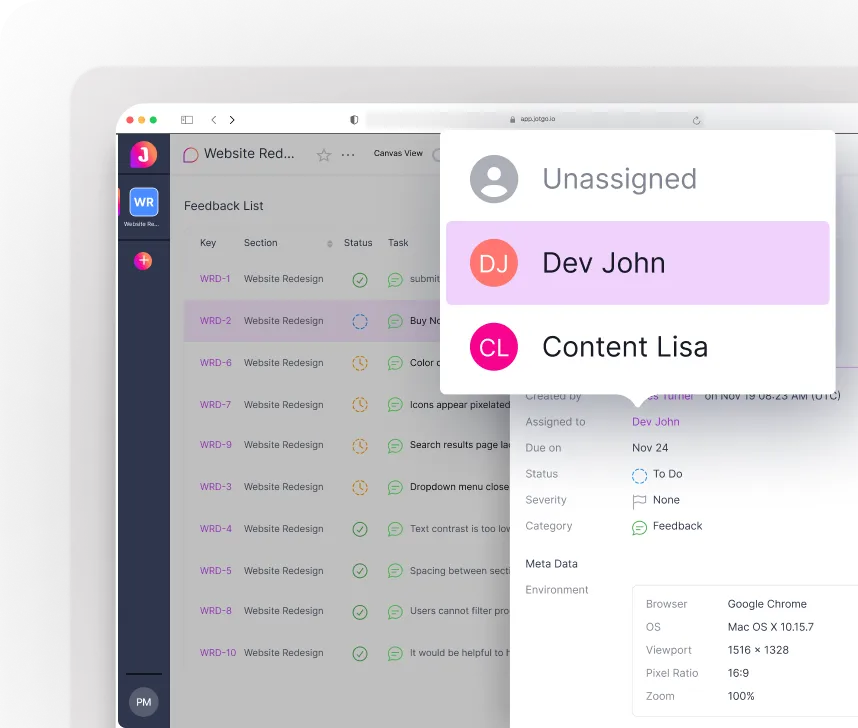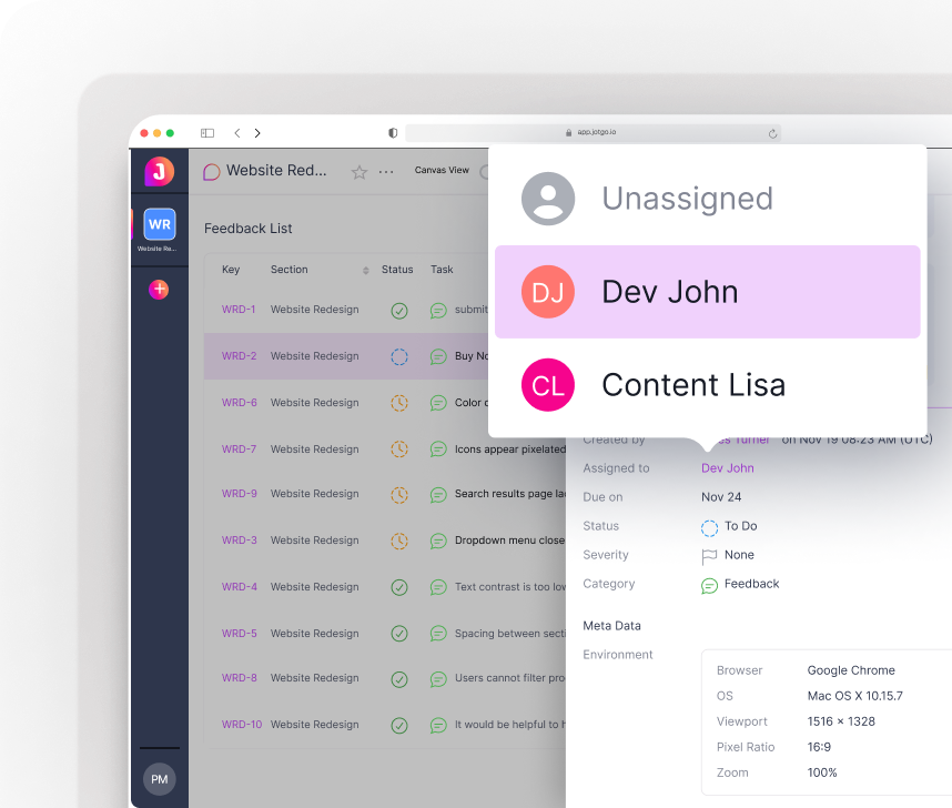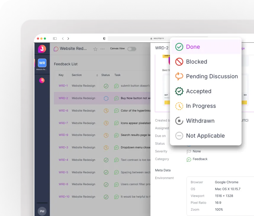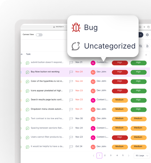 Review, triage, and manage reports from every source — QA, stakeholders, or end users — in a clean, fully organized dashboard.